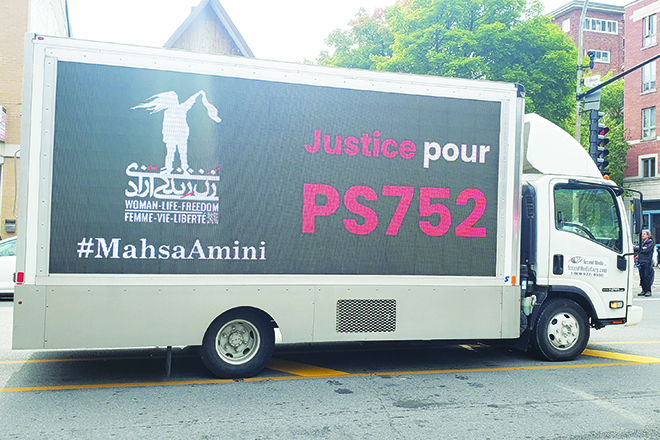 این تظاهرات بی‌نظیر که بیش از دو ساعت به طول انجامید از ساعت ۱۴ روبروی دانشگاه مک‌گیل در خیابان شربروک غرب شروع شد و پس از حدود نیم ساعت جمعیت به سمت مجسمه sir George-Étienne Cartier در پارک مونت رویال حرکت کرد. شرکت‌کنندگان با حمل پلاکاردهای «Justice For PS752»، «Woman Life Freedom»، « MAHSA AMINI»، «زن، زندگی، آزادی» ... و شعارهای «آزادی حق ماست، ژینا اسم رمز ماست»، «این‌همه سال جنایت، ننگ بر این ولایت»، «مهسايیم، نداییم/ ما همه یک‌صداییم»، «جمهوری اسلامی، نمی‌خوایم نمی‌خوایم» ... تجمع بزرگ دیگری را در حمایت از زنان و اعتراضات داخل ایران رقم زدند و اعتراض خودشان را به جمهوری اسلامی اعلان کردند.