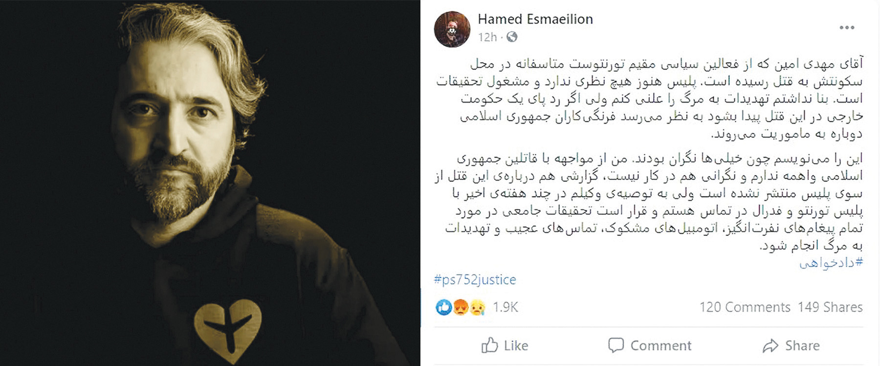 بیانیه سرویس اطلاعاتی کانادا: «بازیگران دولت متخاصم، ازجمله جمهوری اسلامی ایران، اعضای جامعهی کانادایی را رصد و ارعاب میکنند و جوامع دیاسپورا اغلب بهطور نامتناسبی هدف قرار میگیرند.[...] سازمان امنیت کانادا CSIS بهطور فعال چندین تهدید جانی ناشی از جمهوری اسلامی ایران بر اساس اطلاعات معتبر را بررسی میکند. درنهایت این فعالیتهای خصمانه و مداخلات خارجی امنیت کانادا و کاناداییها و همچنین ارزشهای دموکراتیک و حاکمیت ما را تضعیف میکند.»