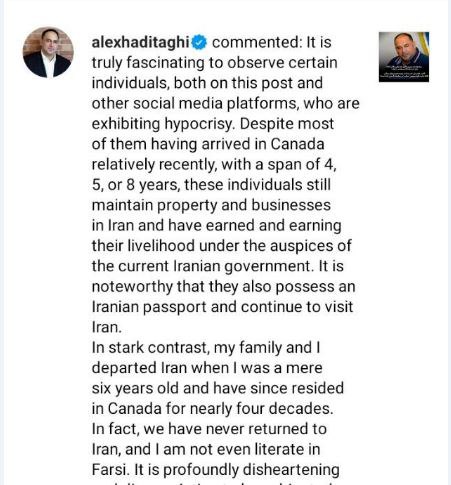آقای هادی تقی در این کامنت بدون اشاره به اصل ماجرای مطرح شده در گزارش و در پاسخ به کامنتهای مخالف و منفی اشاره کرده: «مشاهده افراد خاص، چه در این پست و چه در دیگر پلتفرمهای رسانههای اجتماعی که ظاهرسازی میکنند، واقعاً جذاب است. این افراد علیرغم اینکه بیشتر آنها نسبتاً تازهوارد هستند و در یک بازه زمانی ۴ الی ۵ یا ۸ساله وارد کانادا شدهاند، هنوز داراییها و مشاغل خود را در ایران دارند و با حمایت دولت فعلی ایران امرارمعاش کردهاند. قابلذکر است که آنها پاسپورت ایرانی نیز دارند و همچنان به ایران سفر میکنند و این در تضاد کامل با شرایط من و خانوادهام است که در ششسالگی ایران را ترک کردیم و نزدیک به چهار دهه است که در کانادا زندگی میکنیم. ما هرگز به ایران بازنگشتیم و من حتی سواد فارسی هم ندارم. این عمیقاً مأیوسکننده و ناامیدکننده است که به من اتهام بیاساس وابستگی به رژیم کنونی ایران زده میشود. من همیشه بر این باور بودم که ایرانیان بیش از آن چیزی که این نمایش نشان میدهد، از قدرت تشخیص و درایت برخوردارند.»