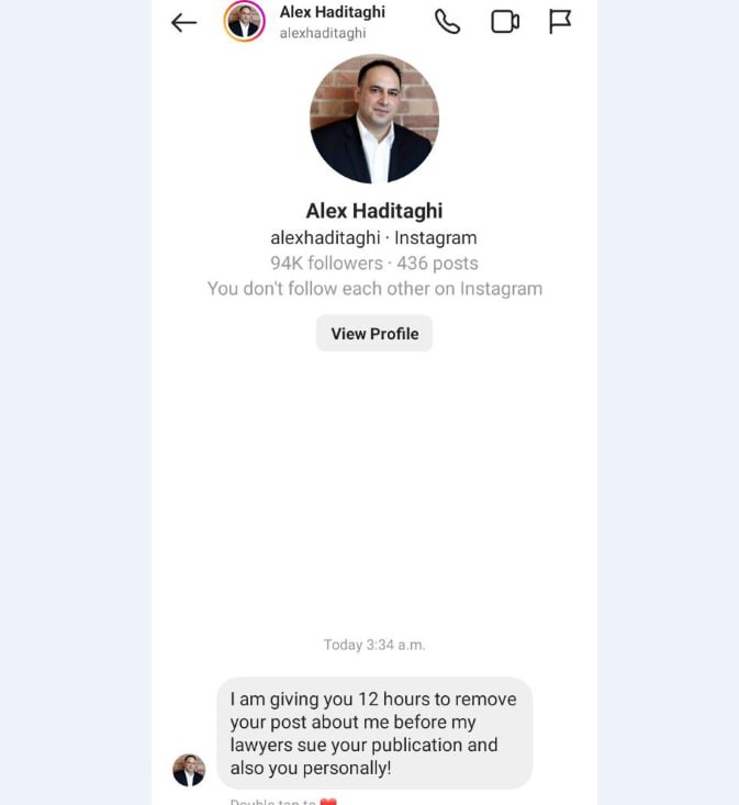 از طرف دیگر صفحه آقای هادی تقی با ارسال پیامی خصوصی در اینستاگرام، رسانه هفته را مورد تهدید قرار داده و ۱۲ ساعت فرصت داده این گزارش حذف شود، در غیر این صورت وکلای او از این رسانه شکایت خواهند کرد. (اسلاید چهارم)