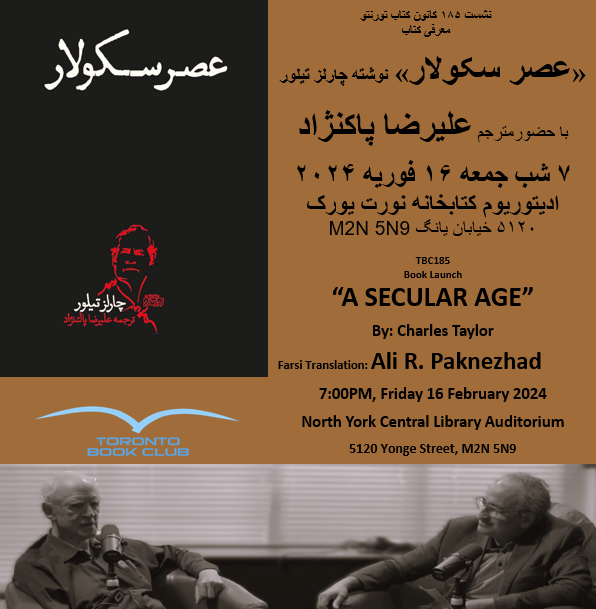 «در نشست ۱۸۵ کانون کتاب تورنتو کتاب «عصر سکولار» نوشته چارلز تیلور، فیلسوف برجسته کانادایی که با ترجمه علی رضا پاکنژاد منتشر شده و در ایران به چاپ سوم رسیده است معرفی خواهد شد.