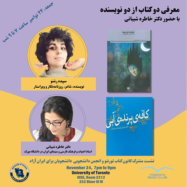 نشست ۱۸۳ کانون کتاب تورنتو با همکاری «انجمن دانشجویان دانشگاه تورنتو برای ایرانی آزاد»، ساعت ۷ بعدازظهر روز جمعه ۲۴ نوامبر ۲۰۲۳، به‌صورت حضوری در دانشگاه تورنتو برگزار می‌شود.