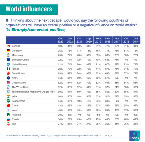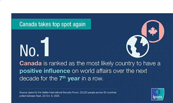 یک نظرسنجی قابلتوجه از سوی موسسه ایپسوس نشان میدهد که طبق رأی مردم، کانادا در جایگاه کشوری با بیشترین تأثیرگذاری مثبت در صحنههای جهانی قرار دارد. در این نظرسنجی، جمهوری اسلامی ایران در انتهای جدول ایستاده است؛ به این معنی که کمترین اثرگذاری مثبت را در تحولات جهانی دارد.