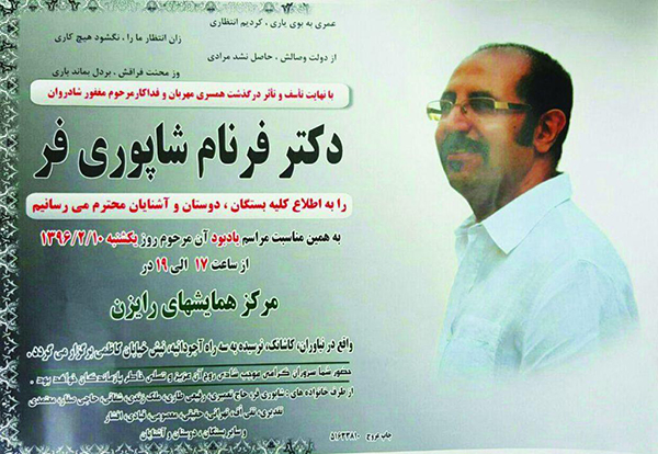 مرگ فرنام نه‌تنها الناز که خانواده‌اش را هم شوکه می‌کند و تا مرز ویرانی می‌برد. ربوده شدن الناز بار دیگر قصه فرنام را هم روی زبان‌ها می‌اندازد. در صفحات مجازی افراد زیادی هستند که فرنام را می‌شناسند و هنوز هم آگهی‌های تسلیتی که برایش چاپ شده است با جست‌وجویی ساده پیدا می‌شود. «با کمال تأثر باخبر شدیم دکتر فرنام شاپوری‌فر از همکاران دامپزشک فعال در صنعت دارویی دامپزشکی، دار فانی را وداع گفته و به دیدار معبود شتافته است. شادروان ورودی سال ۷۶ دانشکده دامپزشکی دانشگاه آزاد گرمسار بوده است.»