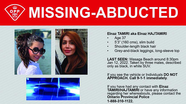 روز دوازدهم ژانویه، گلوبال نیوز اولین گزارش را درباره الناز منتشر می‌کند. در این گزارش پلیس استان انتاریو می‌گوید یک زن با نام «الناز حاجت میری» یا «حاج تعیری» در پی حمله به خانه‌اش در منطقه واساگا Wasaga در شمال تورنتو ربوده شده است. پلیس درباره ملیت او در ابتدا اظهار نظری نمی‌کند و به خبرنگارها می‌گوید: «افسران حدود ساعت هشت و نیم عصر از ماجرا مطلع شدند. هنگامی که به خانه این زن رسیدند، شاهدان به پلیس گفتند که یک زن ۳۷ ساله توسط سه مرد ربوده شده است. این سه مرد به همراه او با یک خودروی شاسی‌بلند سفید، صحنه جرم را ترک کردند. مظنونان، مسلح و خطرناک هستند و پلیس نگران امنیتش است.» اولین مشخصات ظاهری الناز هم اعلام می‌شود: «قد او پنج فوت و سه اینچ، با اندامی باریک و موهای مشکی تا شانه است.» عکس‌های کمی از الناز منتشر می‌شود از جمله عکسی که او پشت به رودخانه‌ای ایستاده است و به دوربین لبخند زده است. عکسی که در واقع نصف یک کادر را نشان می‌دهد. چون در عکس اصلی الناز در کنار همسرش است؛ فرنام.