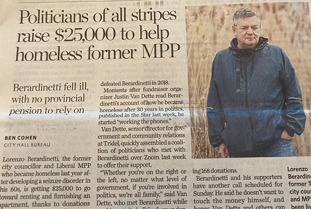 پس از اینکه ماه گذشته تورنتو استار برای اولین بار گزارش داد که براردینتی در روزهای سختی قرار گرفته است، سیاستمداران انتاریو برای کمک جمع شدند.
