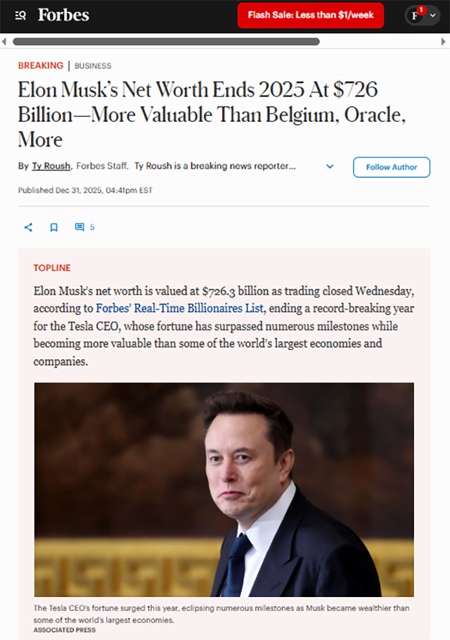 بر اساس فهرست لحظه‌ای میلیاردرهای مجله فوربز، ثروت خالص ایلان ماسک در پایان معاملات روز چهارشنبه و در آخرین روزهای سال ۲۰۲۵ به ۷۲۶ میلیارد و ۳۰۰ میلیون دلار رسید. هرچند سهام تسلا در آن روز با افت یک‌درصدی مواجه شد و ۳.۳ میلیارد دلار از دارایی او کاست، اما این کاهش جزئی نتوانست مانع ثبت یکی از شگفت‌انگیزترین سال‌ها در تاریخ ثروت‌های فردی شود.