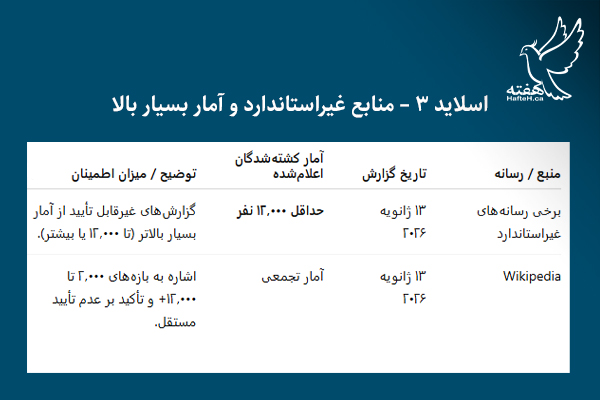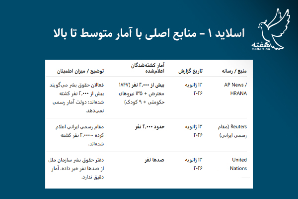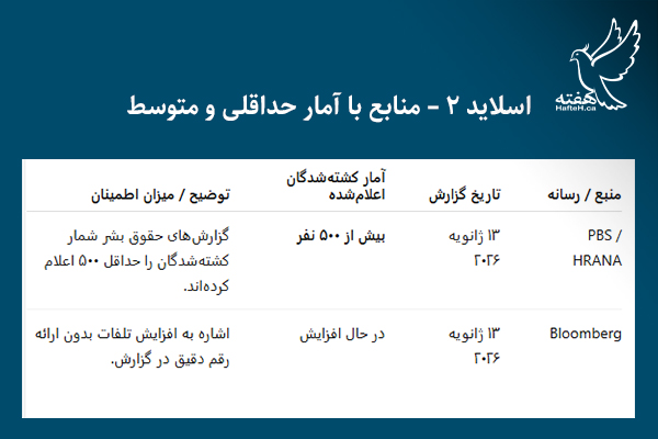 به گزارش apnews آمار کشتهشدگان تاکنون بسیار متفاوت گزارش شده است. بر اساس فعالان حقوق بشر و گزارشهای رسانهای معتبر، تعداد جانباختگان اعتراضها بیش از ۲,۰۰۰ نفر تخمین زده میشود؛ این شامل معترضان، اعضای نیروی انتظامی و کودکان است که قربانی درگیریها شدهاند. جمهوری اسلامی ایران برای اولین بار نیز پذیرفته که شمار قابلتوجهی کشته شدهاند اما آمار دقیق رسمی ارائه نکرده است.