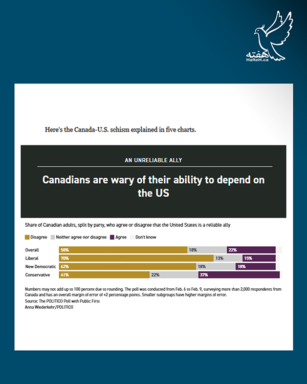 نتایج تازه یک نظرسنجی که به سفارش سایت معتبر پولیتیکو انجام شده نشان می‌دهد که تقریباً نیمی از کانادایی‌ها آمریکا را تهدیدی بزرگ‌تر از روسیه برای صلح جهانی می‌دانند و اعتماد به این کشور کاهش یافته است، موضوعی که پیامدهایی برای سیاست خارجی و اقتصاد کانادا دارد.